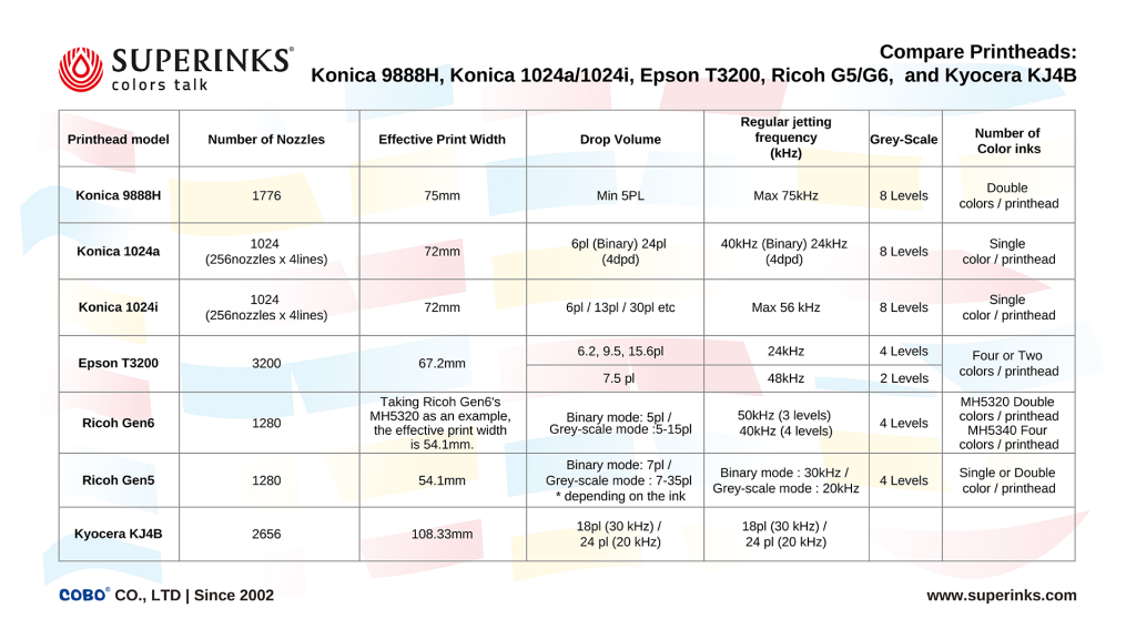 近日,一份聚焦柯尼卡9888H、1024i/1024a、理光G6及爱普生T3200四大主流工业打印喷头的参数对比表引发行业广泛关注。该表系统梳理了各型号在喷嘴数量、有效打印宽度、墨滴体积、喷射频率等核心指标的差异,为设备制造商选型及产线升级提供了直观权威的参考依据。与此同时,“是否存在综合性能超越理光G6的喷头”这一行业热点问题,也随市场反馈的持续积累逐渐明晰。