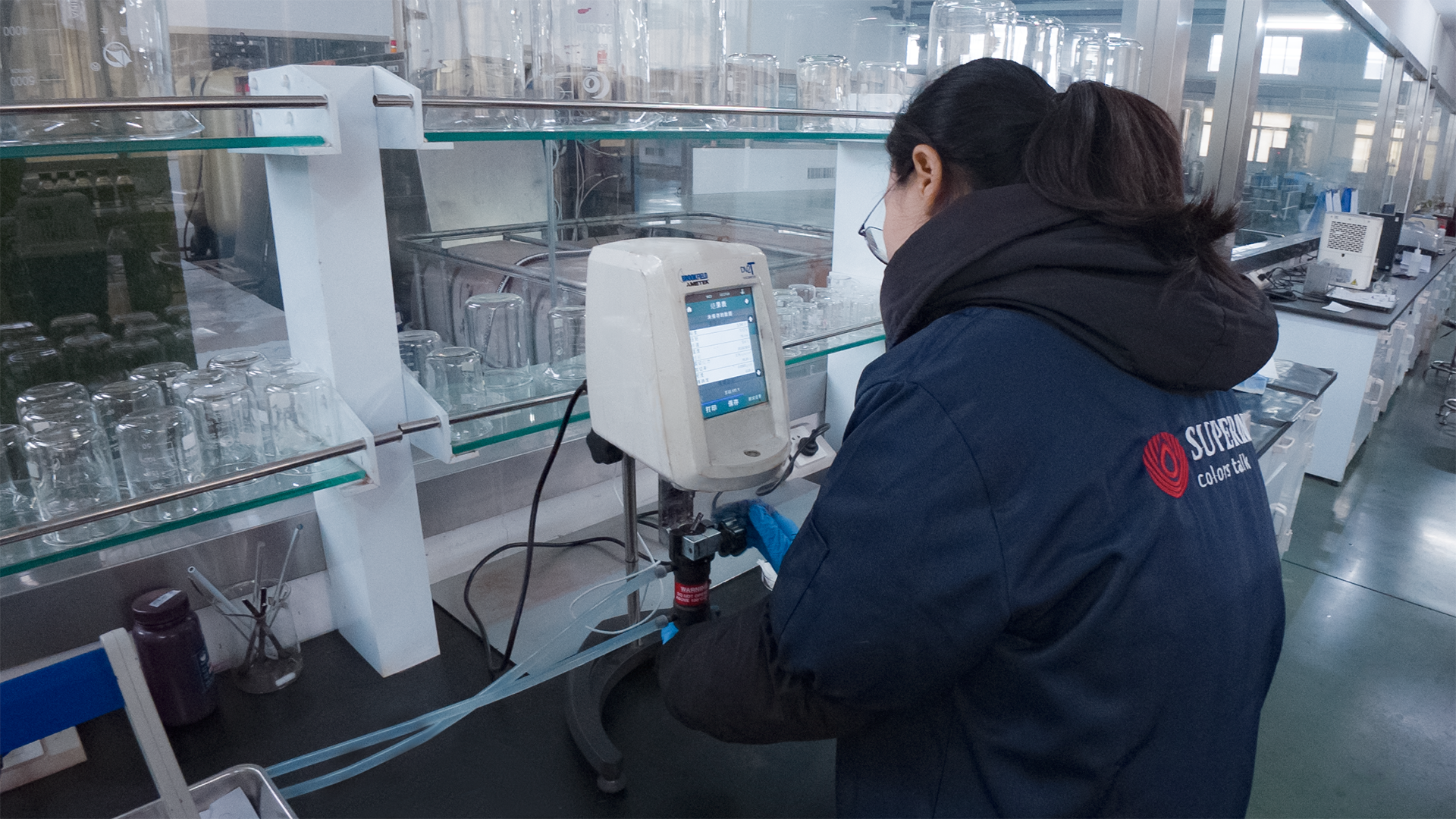 墨水制造完成后,质检员根据检查表核对每一种墨水的质量进行严格检查。